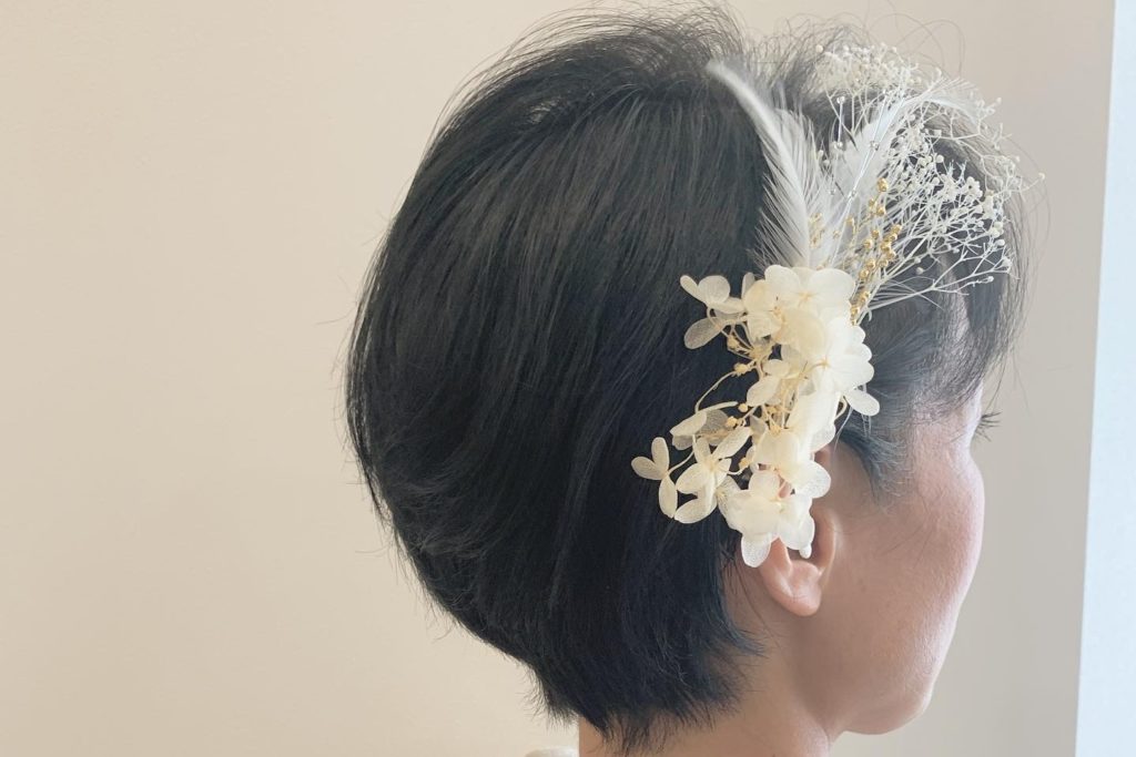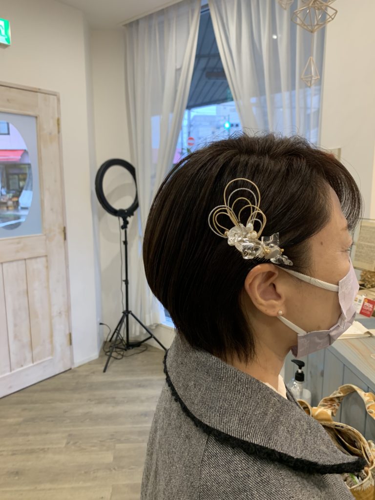 アレンジができないショートには、少し大振りのヘアアクセサリーで主役感が出るようにしました☆