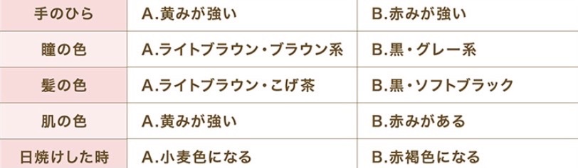 Aが多い方はイエベ、Bが多い方はブルベの可能性が高いです!