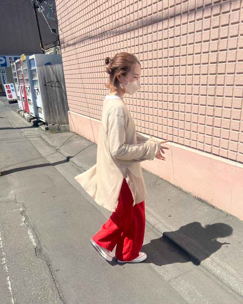 今年流行のカラーパンツ、赤パンに挑戦しました。