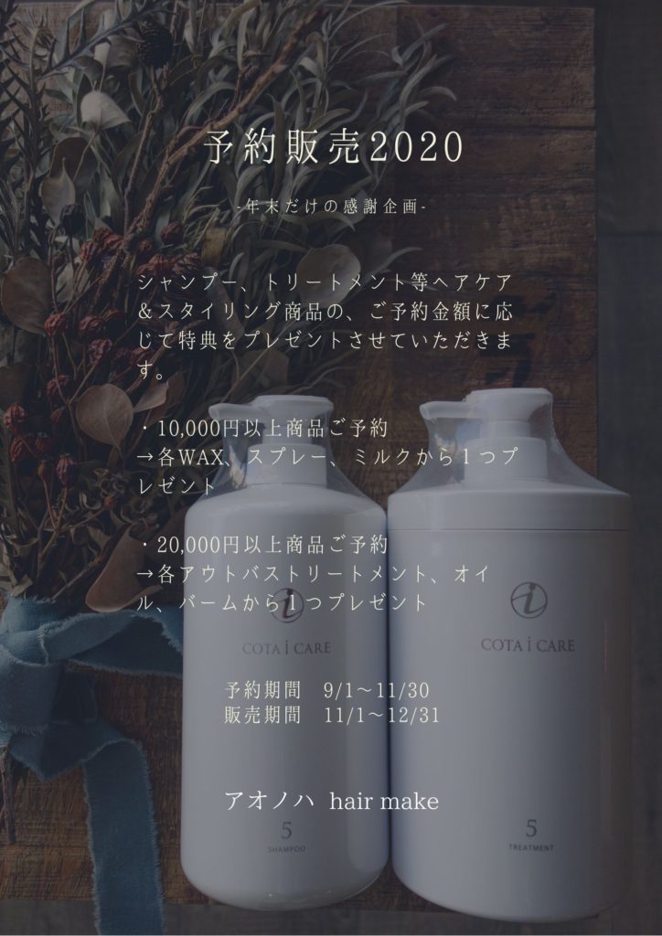 ご予約金額20,000円以上(税別)で、ベース剤(流さないトリートメント)、オイル、バーム、スプレー(大)から1つプレゼント。